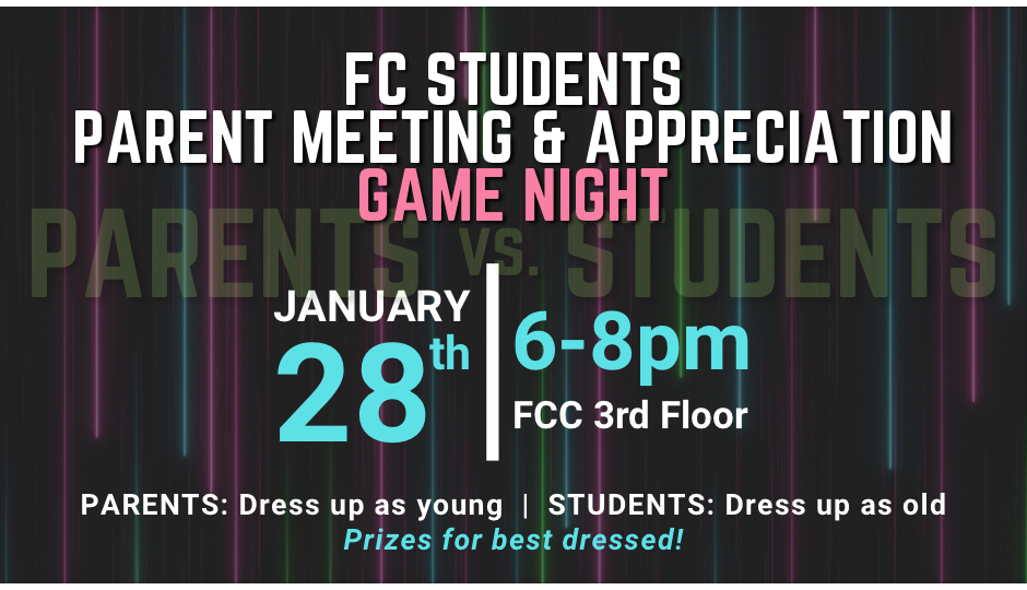 Get ready for an epic showdown! Parents and students will face off in a fun-filled game night to see who takes home the Generational Glory Cup and bragging rights for the year. Prizes will be awarded for best dressed—students come dressed as “old,” and parents come dressed as “young.” Join us for laughter, friendly competition, and unforgettable memories!