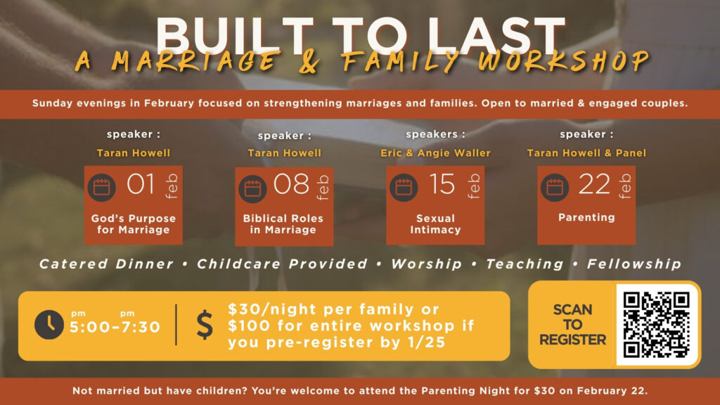 This 4-week workshop will take place each Sunday of February. These nights will take place from 5:00-7:30pm and will include childcare, catered dinner, worship, teaching, fellowship, and more. We invite all married and engaged couples to join us for this meaningful time together. Each week we will be covering one of these topics: God’s Purpose for Marriage, Biblical Roles in Marriage, Sexual Intimacy, and Parenting.